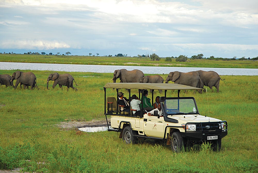 Parc national de Chobe Une visite dans le nord du Botswana est un ajout étonnant à n’importe quel tour d’Afrique australe. Le parc national de Chobe abrite la plus grande population d’éléphants d’Afrique, et lors de safaris fantastiques, vous vous aventurerez dans certaines des plus grandes zones d’observation de la faune sauvage de toute l’Afrique. Le parc compte près de 11 000 km2 d’écosystèmes diversifiés qui abritent des lions, des léopards et des buffles d’Afrique, ainsi que plus de 450 espèces d’oiseaux. Avant de partir, faites une croisière sur la puissante rivière Chobe et regardez le soleil descendre du vaste ciel africain. C’est un voyage qui restera à jamais dans votre cœur.