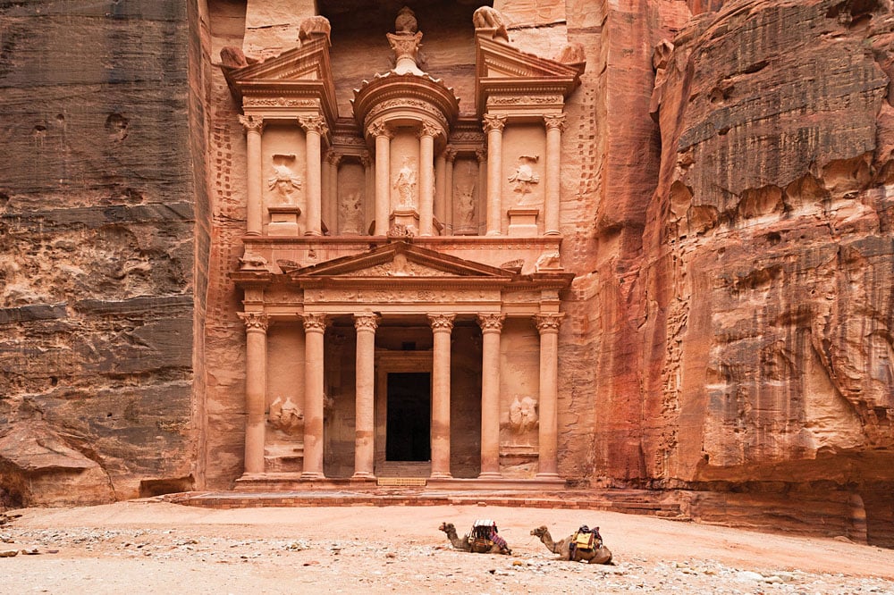 Petra L’ancienne ville de Petra est sculptée dans les montagnes rouges massives qui l’entourent, et est l’une des grandes merveilles du monde. Capitale des Nabatéens, Pétra a servi de carrefour commercial intégral entre l’Arabie, l’Égypte, la Syrie, la Grèce et Rome. Ce site du patrimoine mondial de l’UNESCO compte parmi les sites archéologiques les plus célèbres au monde pour sa combinaison de traditions orientales anciennes et d’architecture hellénistique. Les visiteurs ne voudront pas manquer Al Kzahneh, le temple le plus élaboré de la ville, sculpté dans une paroi rocheuse en grès et haut de 43 mètres.