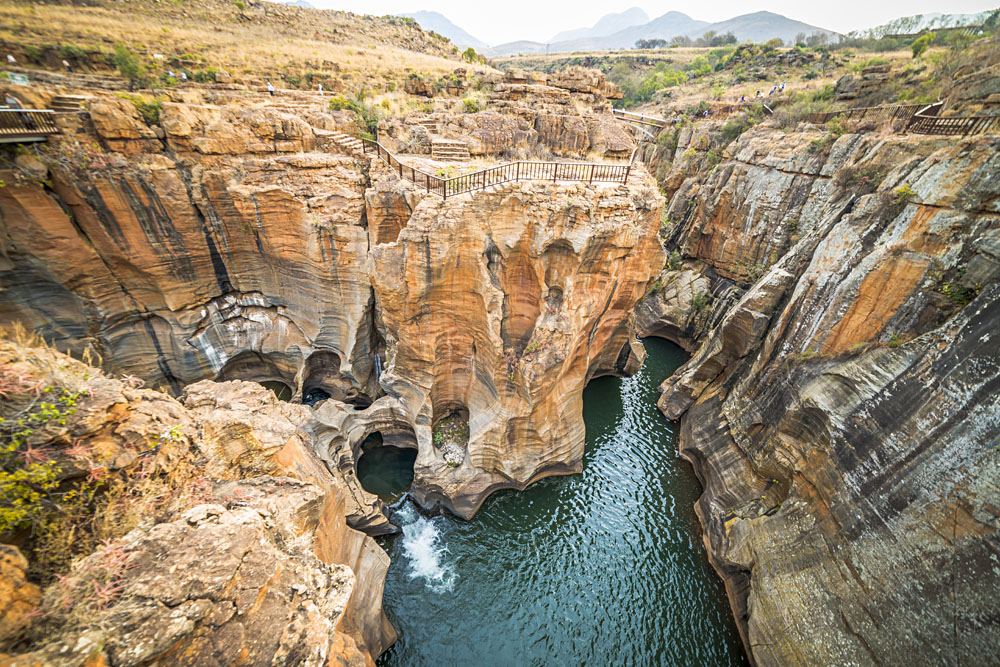 Les nids de poule de Bourke’s Luck Potholes Les nids-de-poule porte-bonheur de Bourke sont une série de formations géologiques naturelles formées par des siècles d’eau qui s’écoulent dans le paysage, une activité qui a donné naissance à une série spectaculaire et complexe de formations rocheuses et de bassins naturels. Cette attraction naturelle se compose de piscines entrelacées de grès. Les nids-de-poule se trouvent là où la rivière Treur rejoint la rivière Blyde, au début du canyon de la rivière Blyde. Avec le temps, certains de ces nids-de-poule fusionnent et de nouveaux se forment. Vous pouvez voir les nids-de-poule depuis plusieurs points d’observation et les ponts qui sillonnent les plus belles formations. Non seulement les formes des formations sont spectaculaires, mais le grès est stratifié et coloré dans des tons d’ambre, d’ocre et de brun. Le paysage change constamment en fonction de la teneur en sol de l’eau, du niveau des rivières et de l’heure de la journée.