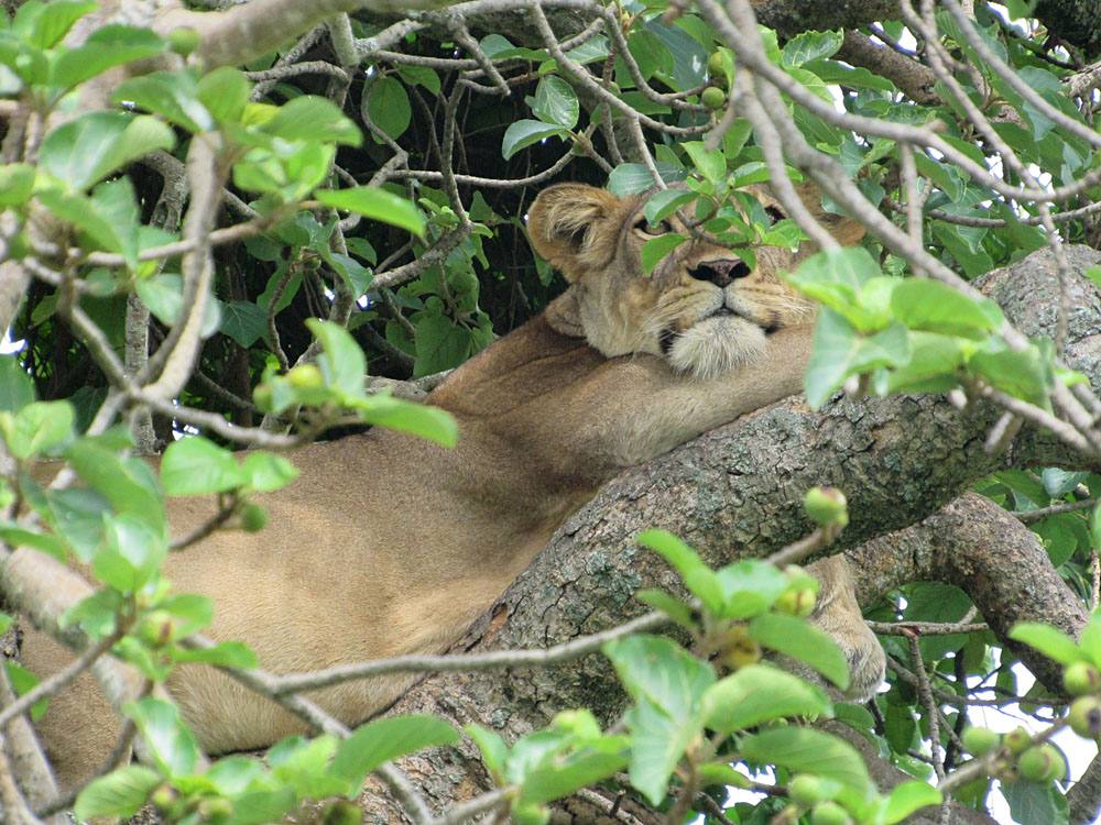 Après un pique-nique à terre, nous sommes montés à bord de notre véhicule et nous nous sommes dirigés vers la partie sud éloignée du parc, où nous allions passer les deux prochaines nuits au camp d’Ishasha Wilderness. Nous nous sommes immédiatement mis en route pour voir si nous pouvions trouver les fameux lions grimpants dans les arbres, repérés pas trop loin. Un safari d’abord pour moi, un safari-voyageur chevronné, voir des lions se détendre dans un arbre m’a fait tourner la tête. En avant à notre loge et wow ! Accueilli comme la royauté, un havre de paix où seule la rivière bredouille nous rappelle que le « buisson » est bien vivant. Après un petit rafraîchissement rapide, mon premier dîner dans la brousse depuis longtemps a été marqué par la visite de « Bill », un buffle qui semblait vouloir goûter à ce que le chef avait préparé ce soir-là.