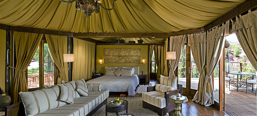 Kasbah Tamadot est un hôtel de luxe entouré de montagnes verdoyantes, de jardins verdoyants et d’un ciel étoilé sans fin. Les murs du château de Peach s’intègrent à l’environnement naturel et révèlent des cours pavées, des tourelles de château, des escaliers en colimaçon, des portes et des plafonds magnifiquement sculptés et de vastes intérieurs remplis de tapisseries exquises du vieux monde. En fait, c’est tellement irréel qu’on a l’impression qu’une princesse Disney est sur le point de sortir par la porte d’entrée à tout moment. Les chambres sont extrêmement spacieuses et débordent sur de grandes vérandas et terrasses qui offrent des vues spectaculaires sur les environs. De superbes tentes berbères parsèment le domaine, avec des plafonds aux matériaux ondoyants et un décor marocain exclusif. Avec ces chambres luxueusement aménagées à la Kasbah Tamadot, vous aurez toujours hâte d’aller vous coucher.