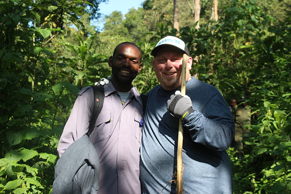 Après un briefing sur ce qu’il faut attendre des guides touristiques ougandais, comment agir et ce qu’implique l’expérience, notre groupe de huit personnes (qui est le maximum autorisé) a été assigné à une famille de gorilles pour faire le trekking. Chacun d’entre nous a eu la possibilité d’engager un porteur (très recommandé, le tout pour le très faible coût de seulement 15 USD), et de là, nous avons été présentés aux deux guides ougandais de la faune sauvage et à l’équipe de sécurité armée qui nous accompagneraient pour la journée. Le porteur est votre main droite tout au long du trek, portant votre sac à dos de la journée, des rations d’eau (chacun doit avoir au moins 4 litres chacun), ainsi que votre sac à lunch. Il ou elle est là pour vous aider à chaque étape du chemin – et je vais être honnête, mon porteur Ben me poussait, me tirait et m’aidait généralement à naviguer sur un terrain très traître, qui va des pentes abruptes aux vallées basses en passant par les espaces ouverts et plats jusqu’à la jungle, littéralement coupée à la machette, épaisse et presque infranchissable.