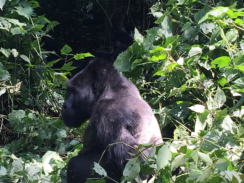 Après deux heures et demie de marche à travers une jungle dense et épaisse (dans un sens), l’odeur envahissante des gorilles et des insectes qui les entourent est devenue plus répandue. Enfin, le moment était enfin arrivé….. voir un dos argenté, une mère, et ses bébés à quelques mètres de là, c’est quelque chose qui va durer pour toujours chez moi !